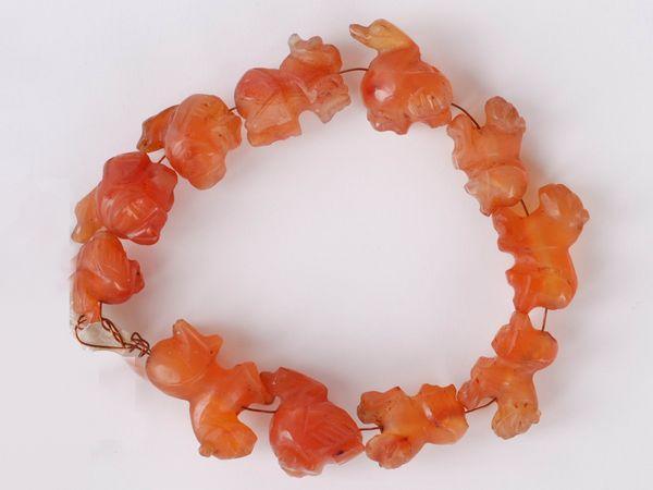 合浦出土文物中,还有不少玛瑙配饰。比如,有一件玛瑙佩饰,由十一件小动物组成,其中鹅五件,狮六件。工匠采用圆雕技法,简练地表现动物的各部位,制作工整、形体准确、构思巧妙、形态生动。战国至汉代,玉雕动物佩饰进入鼎盛时期,各类题材层出不穷,形态千变万化。玛瑙出自西域,在合浦汉墓中有玛瑙饰物的出土,反映出汉时中原与西域已有广泛交流。