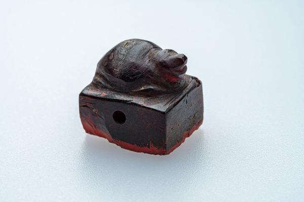 琥珀,汉称“虎魄”。我国古代的琥珀原料,绝大多数来自波罗的海和缅甸(掸国)。广西汉墓中所见的琥珀,出土时多呈半透明的暗红色,出土后氧化颜色变黑,其质地致密,内少丝状碎裂纹,与缅甸出产琥珀最为接近。刻有汉字的琥珀印章,应为进口原材料在本地加工。